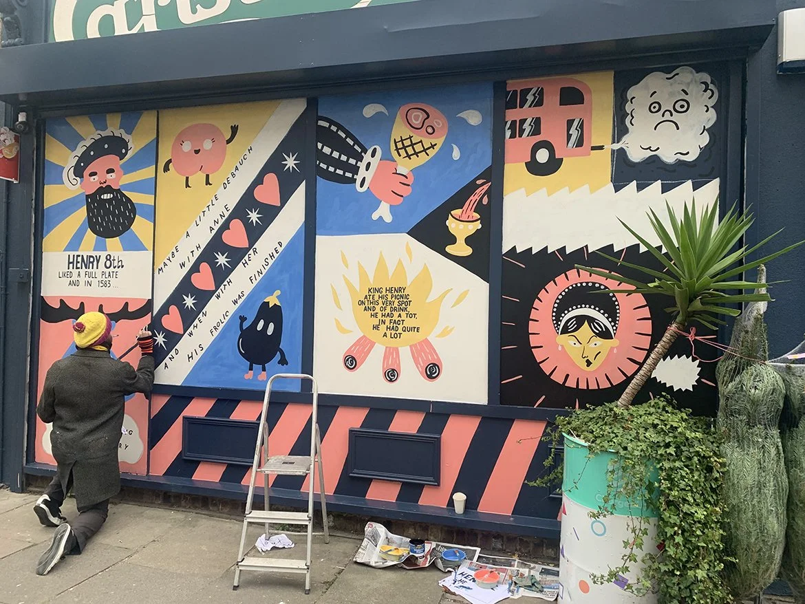 The new shopfront acts as a joyful stage, reflecting the power of pride and connection that art can bring to a neighbourhood. The new shopfront also tells the story of King Henry VIII, written as a poem by local writer Mark Johnson.