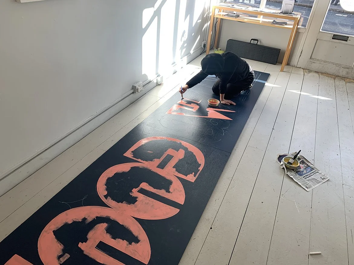 Paul Bower’s witty and ironic work was ideal for interpreting the poem into a cheeky playground of fruit and veg characters. Raissa Pardini, whose work focuses primarily on typography, added a blend of 80s/Deco/Pop style, infusing a cool vibe to the painting. The work’s playfulness engages both young and old audiences, and Engin has reported many people stopping by to comment and give congratulations.